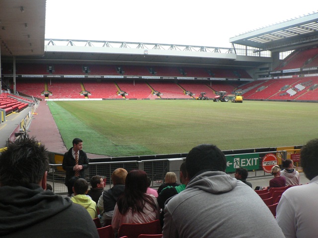 25.05 – dla fana Liverpoolu data szczególna (dla niezorientowanych – rocznica pamiętnego finału w Stambule). Właśnie na ten dzień, na godzinę 12. zarezerwowaliśmy nasz Stadium Tour po Anfield. O 8:30 wyruszyliśmy w drogę. Po drodze spotkaliśmy – jak się później okazało – kibica Evertonu. Sam zaoferował nam swoją pomoc – widocznie po raz kolejny musieliśmy nieźle wyglądać z mapą w ręku. Dzięki niemu straciliśmy z pół godziny, bo zaprowadził nas tą samą drogą, którą przyszliśmy, na przystanek, podczas kiedy my wyraźnie powtarzaliśmy mu, że chcemy dojść tam pieszo, bo na mapie nie wyglądało to za daleko. Na samym końcu wyjawił nam swoją wiarę i tylko się uśmiechnął. Także znowu z punktu wyjścia ruszyliśmy w trasę.